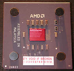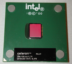 above on the right.Put the dab of Arctic Silver II you removed from the heatsink base onto one corner of the CPU core as shown in the photo to the right. Only apply the thermal compound to the top of the actual CPU core. (Also known as the slug or die.) In the photo to the right it is the small raised blue rectangle in the middle of the Celeron II processor. On an AMD Duron or T-bird, it is the small raised rectangle in the center of the AMD processor. Only a very small amount of Arctic Silver is needed on modern CPU cores, about 1/2 the size of an uncooked grain of short-grain white rice or 1/4 of a BB. |