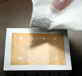 | 4. | Clean the mating surfaces completely with a low residual solvent (isopropyl alcohol will work) and a LINT FREE cloth. (i.e. lens cleaning cloth) If the heatsink surface has had thermal compound previously applied, the surface should be thoroughly scrubbed and cleaned with isopropyl alcohol or acetone (nail polish remover). It is important to keep the surfaces free of foreign materials and NOT to touch the surfaces (a hair, piece of lint, and even dead skin cells can significantly affect the thermal interfaces performance, especially on modern small core CPUs as the surface area is already severely limited). In addition, oils from your fingers can adversely affect the performance by preventing the micronized silver fill from directly contacting the metal surface. (Finger prints can be as thick as 0.005") |